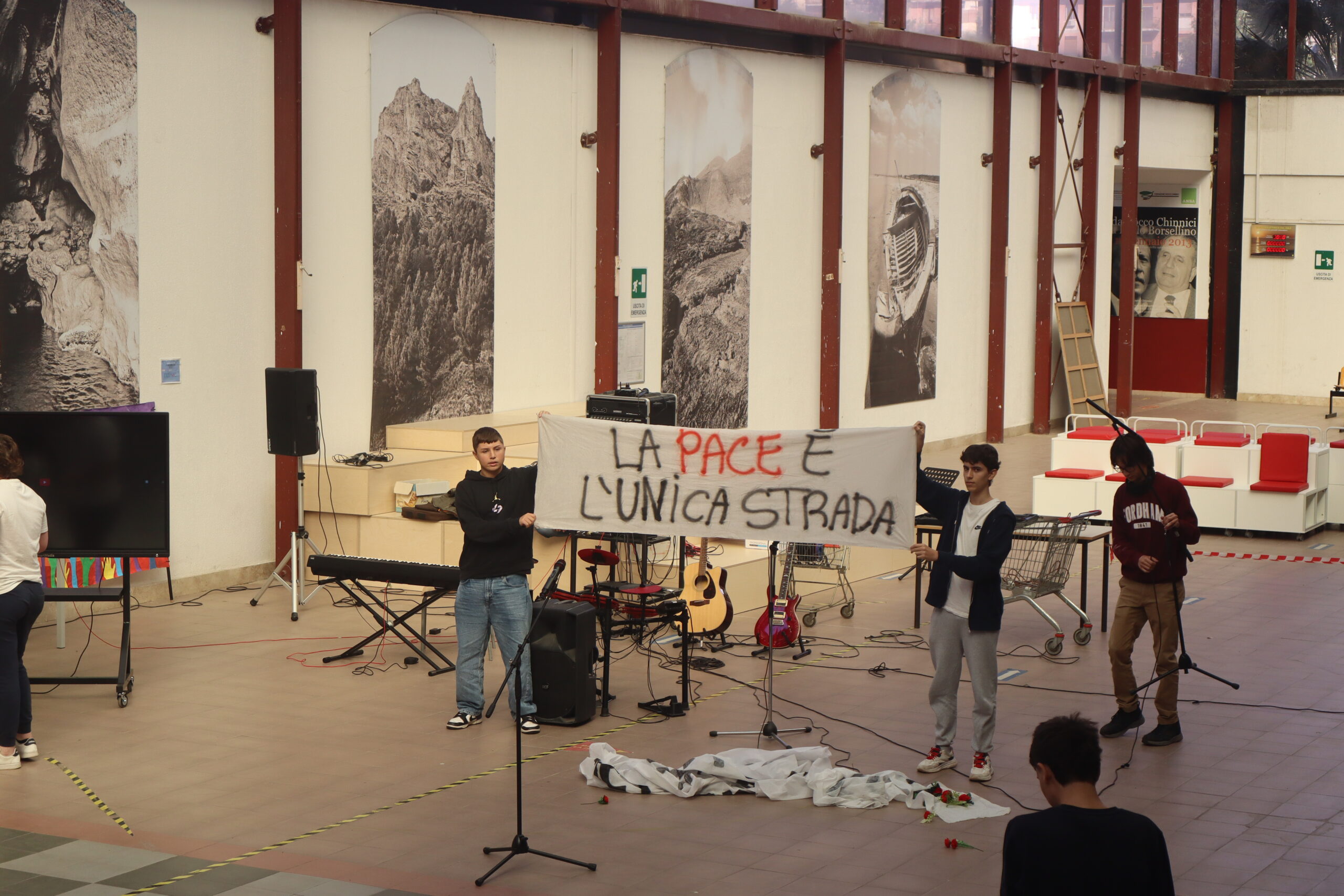l’Agorà del Liceo Meli si è trasformata in un “luogo di luce e di ascolto sotto il segno della pace e della solidarietà”. All’interno del Progetto di Educazione Civica “Il Meli per la pace: si vis pacem, para pacem”, promosso dalle professoresse E. Macrì e G. Maggio, ha preso vita una grande manifestazione che ha visto protagoniste quasi tutte le classi del nostro Istituto. Nelle aule sotto la guida dei docenti erano stati attivati percorsi di conoscenza e riflessione profonda sulla guerra e sulla pace, si era parlato di popoli lacerati, di confini invisibili e di ferite antiche — con particolare attenzione al conflitto israelo-palestinese. Su questi temi sofferti gli studenti hanno scelto di ascoltarsi e tenersi per mano, con occhi aperti e cuore acceso. In Agorà sono stati osservati due minuti di silenzio in ricordo delle vittime di tutte le guerre e del massacro di civili nella striscia di Gaza. E sono nati gesti d’arte: parole, poesie, disegni, canzoni, video e scene di teatro. Ogni classe ha dato forma alla propria visione, trasformando lo studio in emozione e l’emozione in creazione. Perché la poesia è resistenza. È il coraggio di dire pace quando tutto intorno grida guerra. È il miracolo di trasformare la morte in speranza, il silenzio in racconto, l’assenza in una luce che non si spegne.