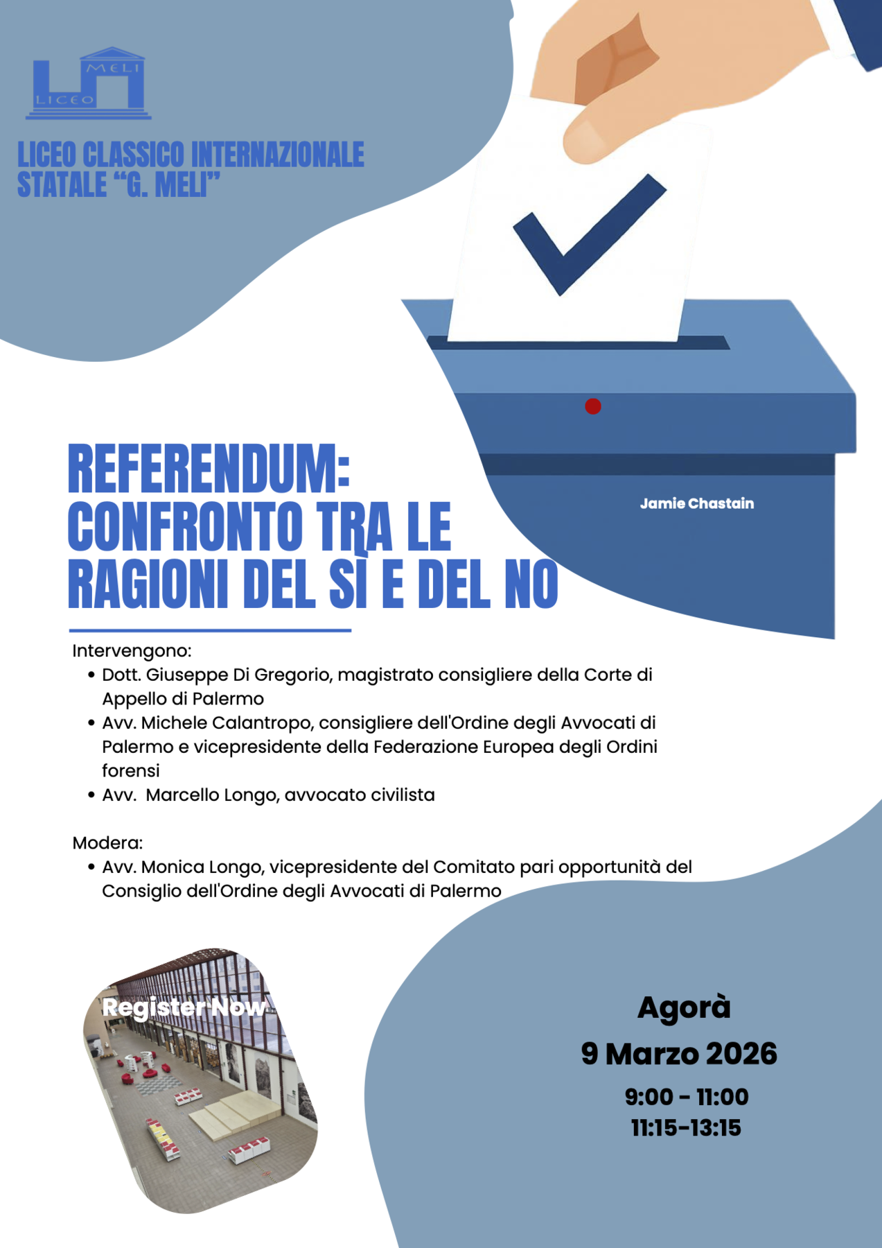 Il 9 marzo 2026, nell’ambito delle attività di educazione civica, il Liceo Meli ha ospitato un incontro-dibattito sul referendum sulla giustizia che si terrà il 22 e 23 marzo prossimi. L’iniziativa è stata rivolta agli studenti delle classi quinte che voteranno per la prima volta. Ha moderato l’incontro l’avv. Monica Longo, vicepresidente del Comitato Pari Opportunità dell’Ordine degli Avvocati di Palermo.